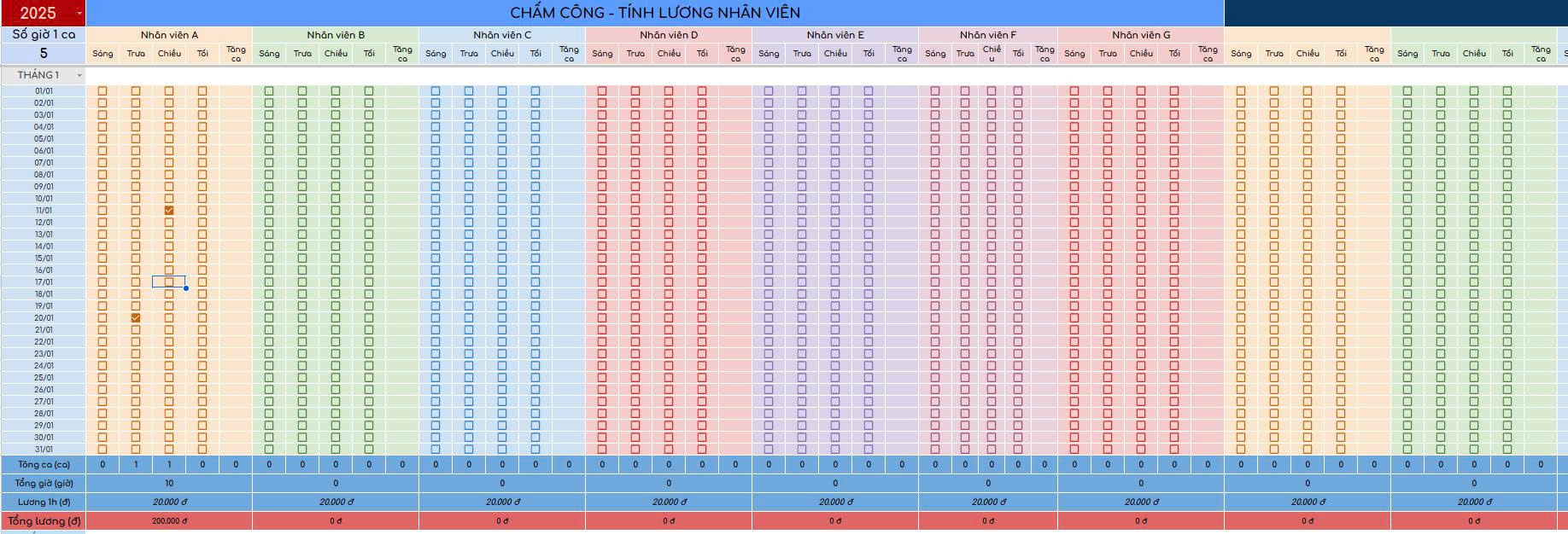 Bảng chấm công theo ca kết hợp tính lương tự động, được thiết kế cho từng nhân viên theo 5 ca: sáng, trưa, chiều, tối và tăng ca. Người dùng chỉ cần tick vào ô tương ứng, hệ thống sẽ tự tính tổng ca, tổng giờ và lương dựa trên mức lương theo giờ. Bảng có màu sắc phân biệt từng nhân viên, dễ quản lý và theo dõi theo từng ngày trong tháng.